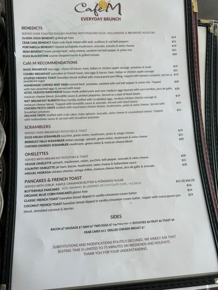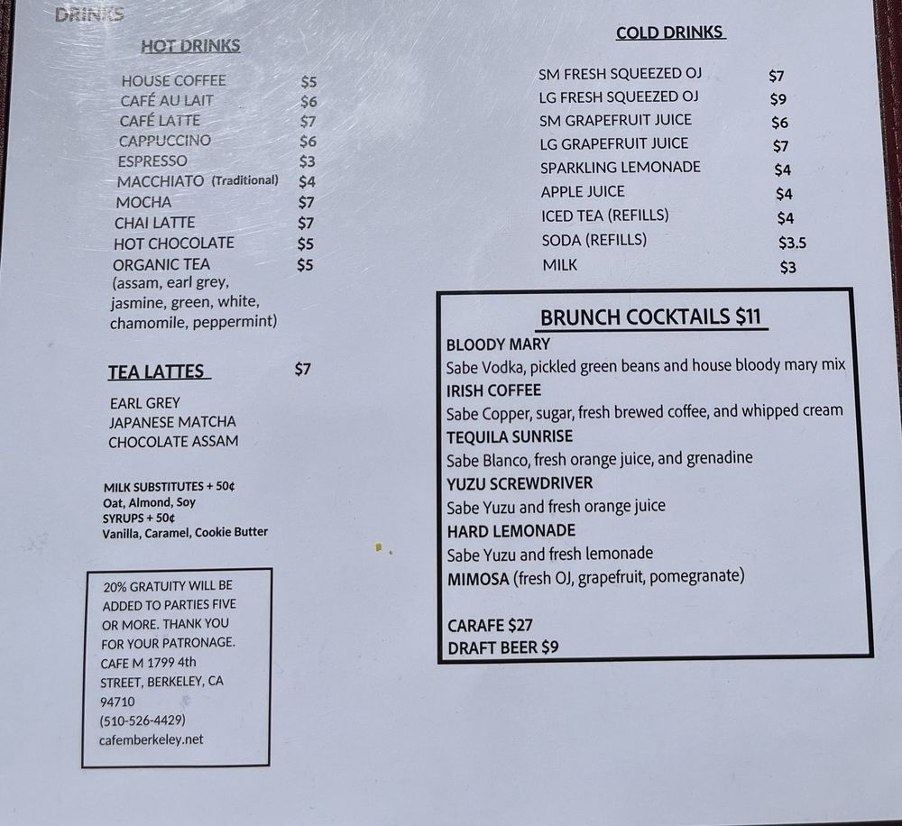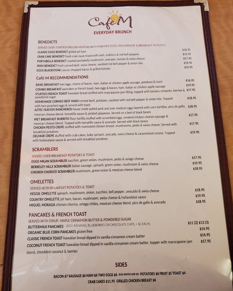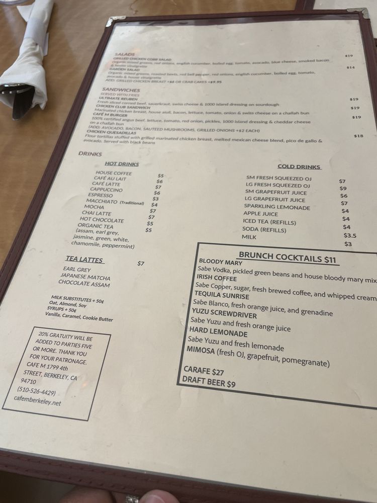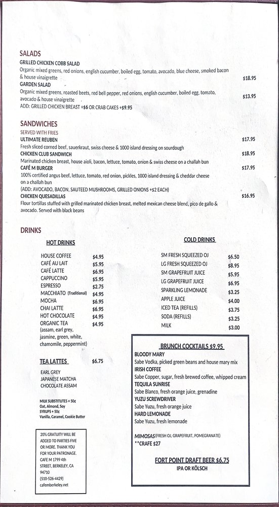 Introducing the menu at Cafe M, located in Berkeley, CA, offers a diverse selection of salads, breakfast & brunch items, and sandwiches. The restaurant provides various amenities such as delivery, takeout, reservations, vegan options, wheelchair accessibility, and more. Customers rave about the delicious offerings, with highlights like corned beef hash, crispy country potatoes, stuffed French toast, and crab cake benedict. The atmosphere is described as comfortable and laid-back, perfect for catching up with friends or enjoying a leisurely meal. Cafe M also prides itself on friendly service, ample outdoor seating, and generous portions. Whether you're a breakfast enthusiast or looking for a casual dining experience, Cafe M is a must-visit spot for flavorful dishes and good vibes.