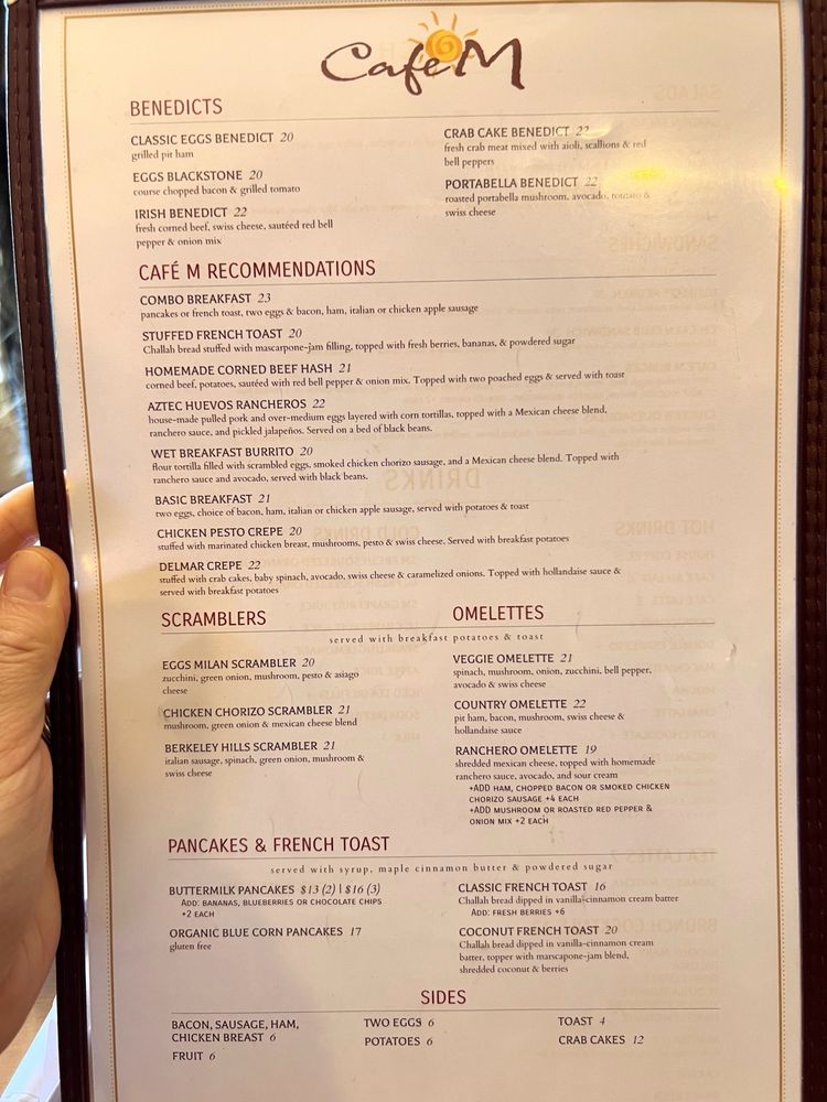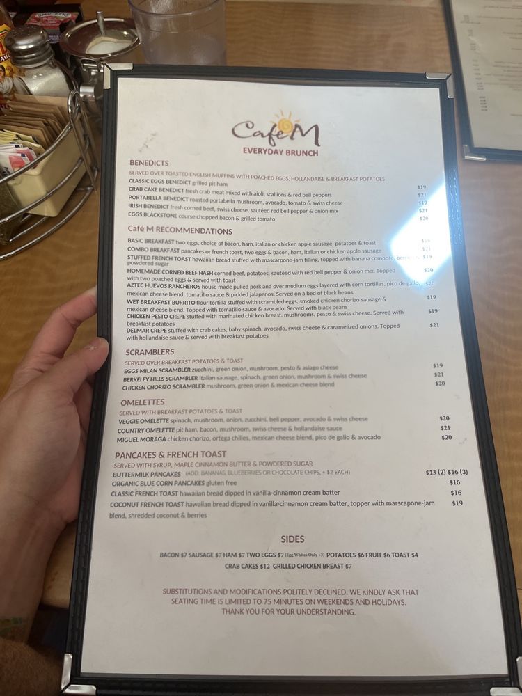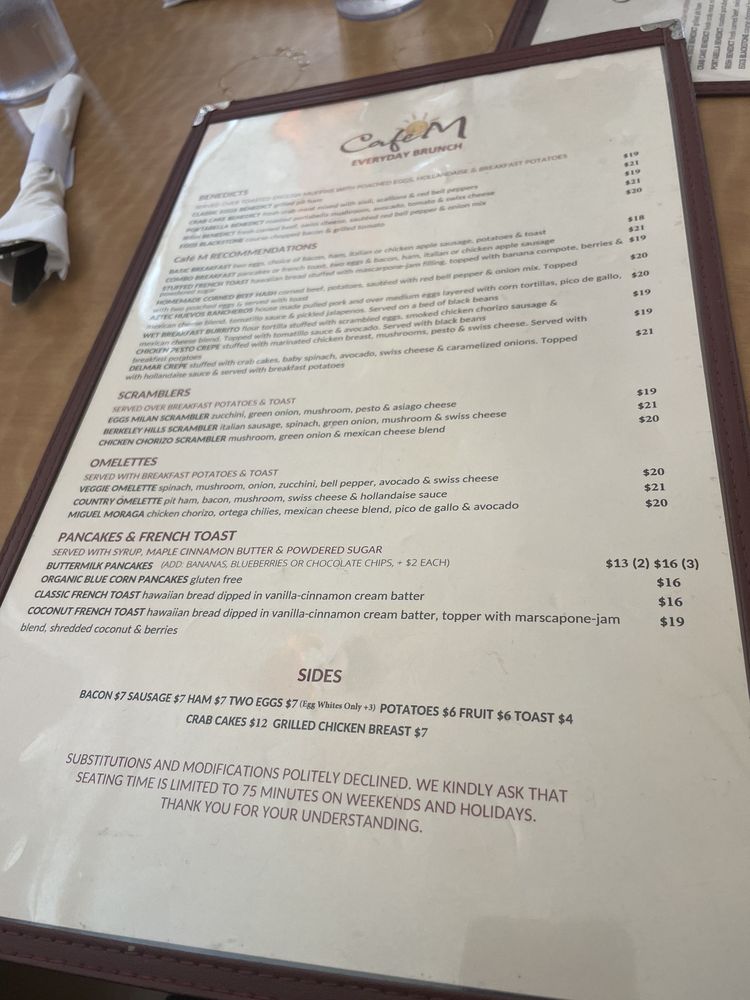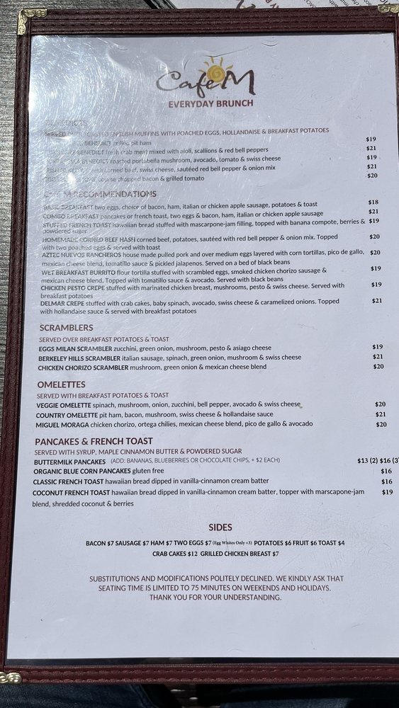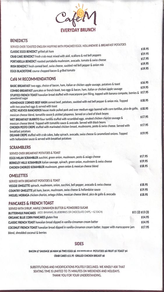 Introducing the menu at Cafe M, located in Berkeley, CA, offers a diverse selection of salads, breakfast & brunch items, and sandwiches. The restaurant provides various amenities such as delivery, takeout, reservations, vegan options, wheelchair accessibility, and more. Customers rave about the delicious offerings, with highlights like corned beef hash, crispy country potatoes, stuffed French toast, and crab cake benedict. The atmosphere is described as comfortable and laid-back, perfect for catching up with friends or enjoying a leisurely meal. Cafe M also prides itself on friendly service, ample outdoor seating, and generous portions. Whether you're a breakfast enthusiast or looking for a casual dining experience, Cafe M is a must-visit spot for flavorful dishes and good vibes.
